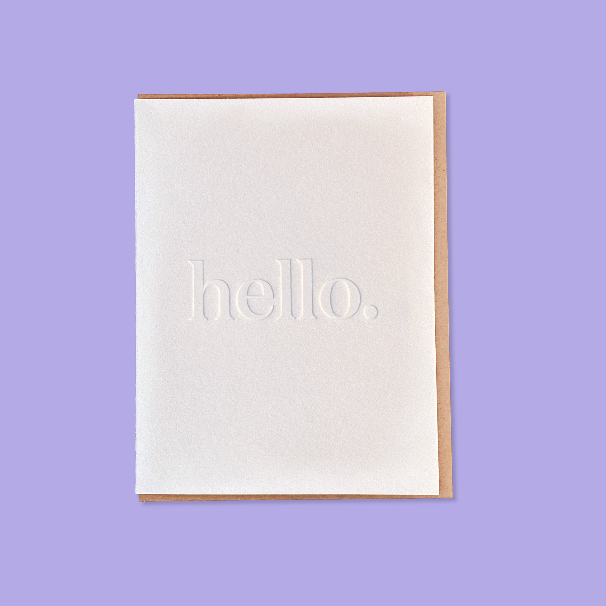 Hand printed on luxurious Crane’s Lettra 300gsm paper, this A2-sized card is crafted with care on a 10x15 Chandler & Price Platen Press using a deep deboss technique. The minimalist “hello.” design is pressed without ink, creating a soft, tactile impression that catches the light and invites touch. Paired with a natural kraft envelope, it’s a quiet, timeless way to say hello, send thanks, or reconnect.